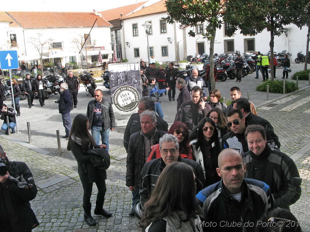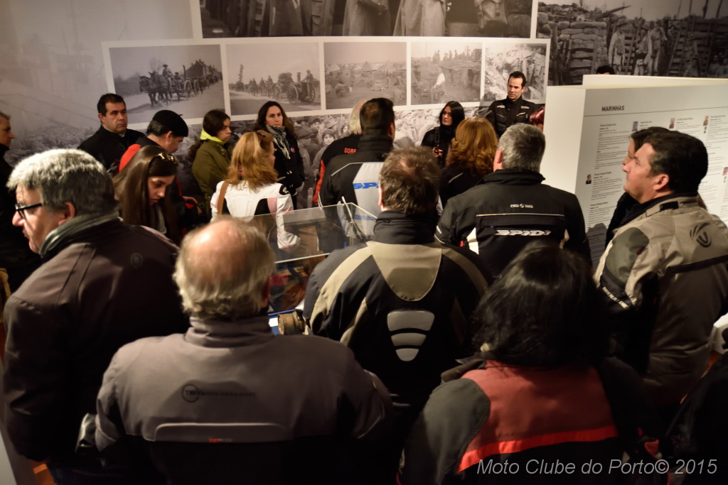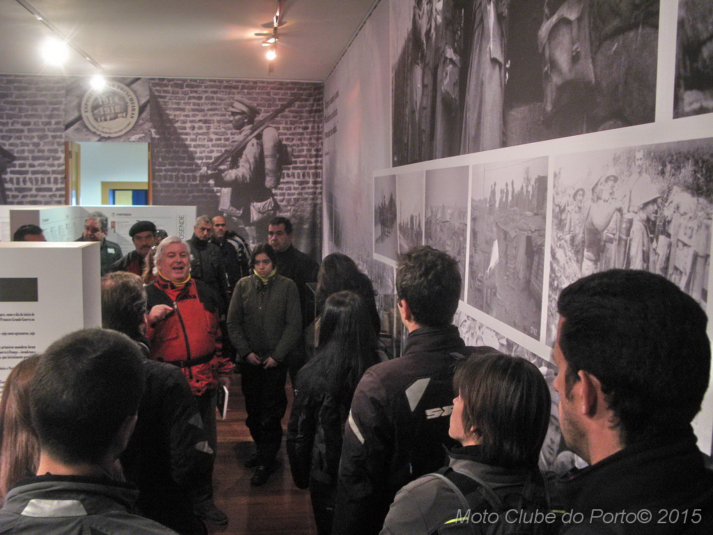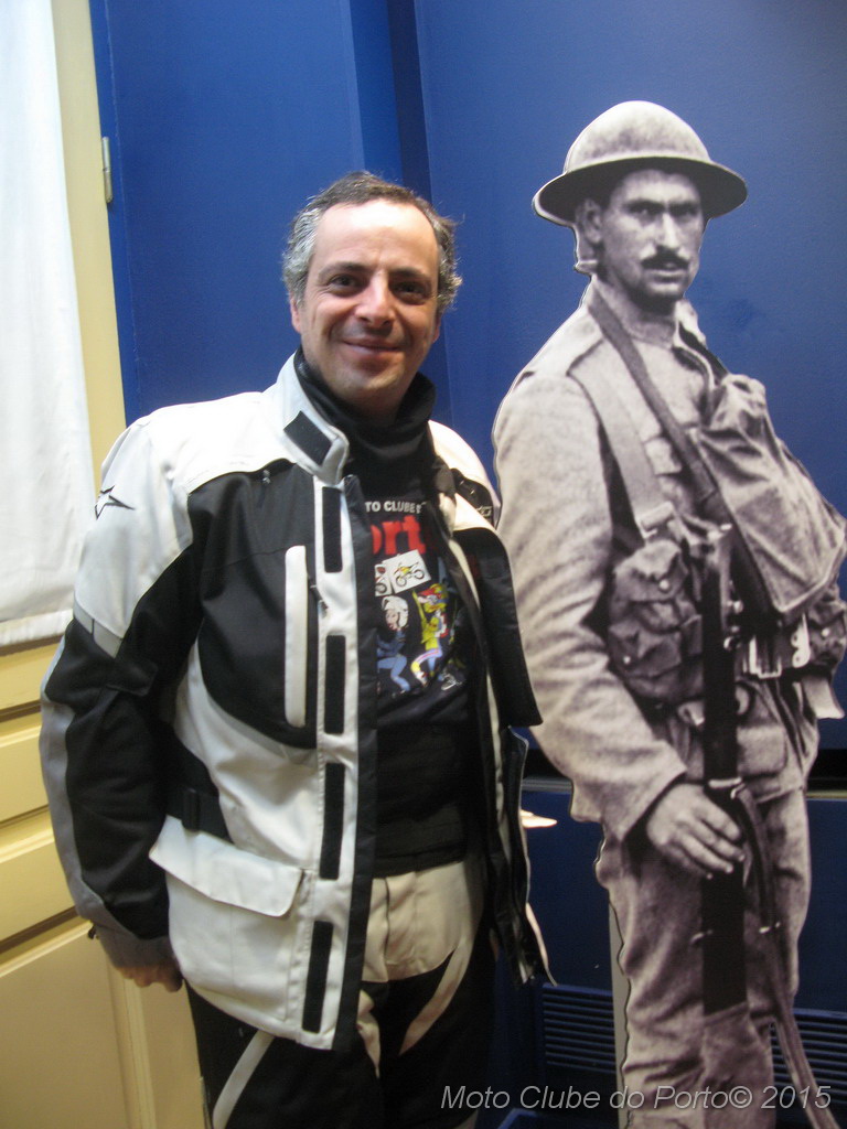 Pontualmente, a comitiva tomou o primeiro café do dia, na sede, recebeu as habituais dicas e fez-se à estrada, pela A28, autoestrada que num ápice colocou a caravana junto aos barcos de pesca artesanal da Apúlia. Voltinha por Ofir e Fão feita, já todas as máquinas estacionavam ordeiramente, em círculo, diante do Museu Municipal de Esposende. Aí, aguardavam-nos os dois motociclistas veteranos irmãos Neiva. E, pela terceira vez para eventos do MC Porto, o historiador Dr. Manuel Albino Penteado Neiva “abriu o livro”! Subiu a um canteiro e explicou-nos em meia hora como Portugal entrou na Grande Guerra de 1914/18, com pormenores e muitas curiosidades. Como o facto de neste 23 de fevereiro de 2016 se completar um século exacto do nosso aprisionamento a mais de 50 navios alemães, em portos portugueses. E que os nossos soldados foram para a guerra armados de… bombos e concertinas. E como detestavam a comida que os ingleses lhes davam. Mas essencialmente a vida dificílima e mortal nas trincheiras. Foram batalhas atrozes que dizimaram milhares de jovens homens portugueses, muitos deles esposendenses.