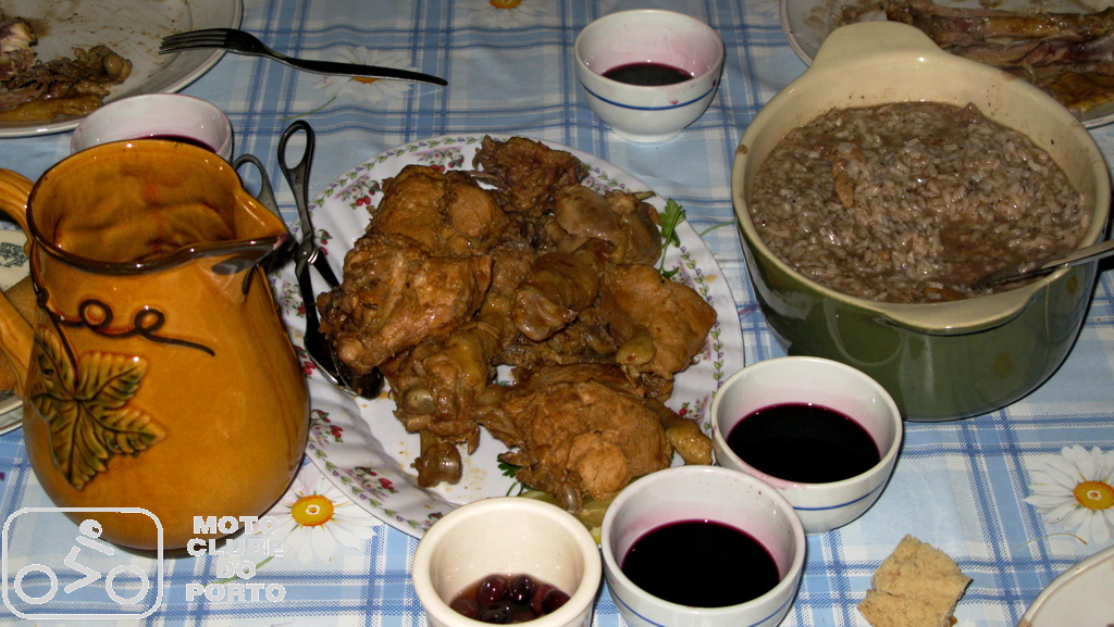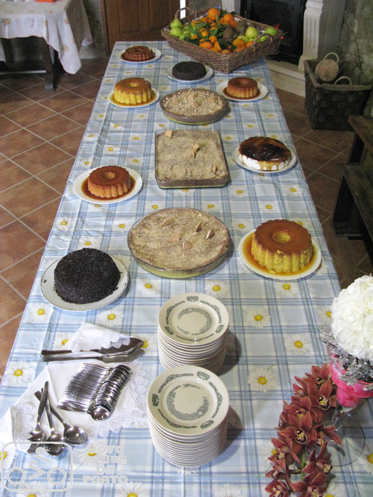 Ritmo prazenteiro até Vila Verde para uma primeira paragem na nossa bem conhecida chocolataria artesanal Chocolate com Pimenta, onde os bombons e os Antoninos, esses pastéis tradicionais recuperados pelo mestre Pedro Sousa, foram acompanhados por um cafezinho à maneira. Pausa para dois dedos de conversa, enaltecendo as “Organizações Isabel & Ribeiro, Sempre com um Tempo Porreiro” antes de mais uns quilómetros, ainda e sempre sem chuva, com passagem por Ponte da Barca e Ponte de Lima, até atingir o alto do Senhor do Calvário. Onde, enquanto se contavam as peripécias da primeira parte de mais um passeio do Moto Cube do Porto marcado pelo forte pendor gastronómico, as deliciosas entradas, do chouriço assado aos bolinhos de bacalhau e rissóis, da broa às azeitonas, iam preparando os estômagos para a monumental cabidela. Cujo aroma começava a invadir aquela que, chegada a época da romaria, nos primeiros dias de agosto, serve de casa dos andores. E se o aroma deixava água na boca, não tardou a comprovar-se a valia destas bravas mordomas, de mão certeira e paladar afinado, com rol de competências comprovadas mais adiante, na altura das sobremesas. Pudins de vários sabores, bolos de bolacha e chocolate e outras tentadoras doçarias caíram ‘que nem ginjas’, prolongando ainda mais um verdadeiro almoço familiar de domingo.
